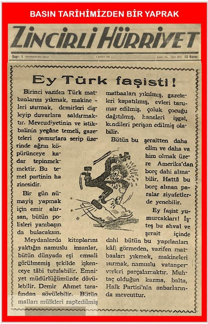 Birinci vazifen, Türk matbaalarını yıkmak, makinelerini ısırmak, demirlerini dişleyip duvarlara saldırmaktır. Mevcudiyetinin ve istikbalinin yegane temeli, gazeteleri çamurlara serip üzerinde ağzın köpürünceye kadar tepinmektir. Bu temel, partinin hazinesidir.