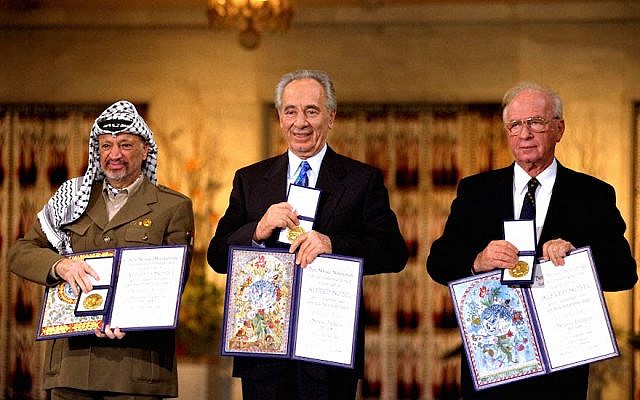 14 Ekim 1994 * Filistin önderi Yaser Arafat, İsrail başbakanı İzak Rabin ve İsrail dışişleri bakanı Şimon Perez, “Ortadoğu’da barışın sağlanması için sürdürdükleri çabalar” sebebiyle Nobel Barış Ödülü’nü aldılar.