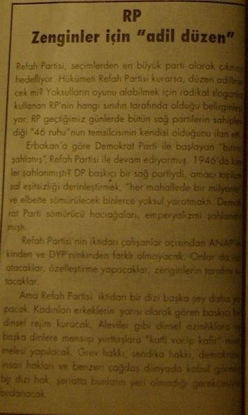 Refah Partisi’nin “adil düzen” söylemini eleştiren Sosyalist İşçi, Demokrat Parti’nin temsil ettiği sağ çizgiyi baskıcı, kapitalist ağababalarından yana tavır alan ve emperyalizmin yararına çalışan bir çizgi olarak niteliyordu. RP’nin “46 ruhu”nun temsilcisi olduğu iddiası karşısında şöyle deniliyordu: