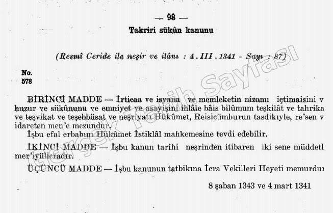 BİRİNCİ MADDE — Irticaa ve isyana ve memleketin nizamı içtimaisini ve huzur ve sükununu ve emniyet ve asayişini ihlâle bâis bilumum teşkilât ve tahrika ve teşvikat ve teşebbüsat ve neşriyatı Hiikûmet, Reisicümhurun tasdikiyle, re’sen ve idareten men’e mezundur.